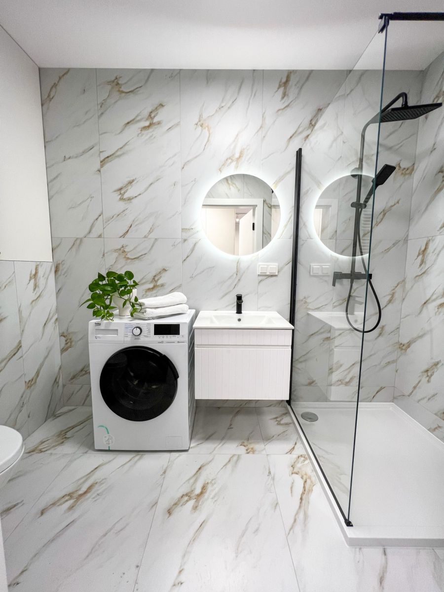 - Łazienki z pralko suszarką i pojemną zabudową meblową,